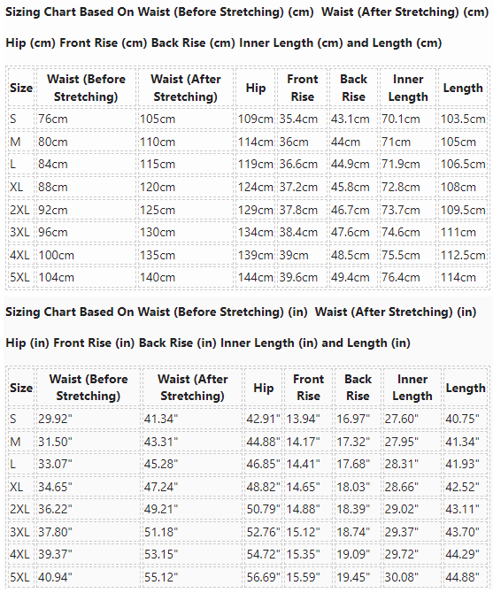 | Size | Waist (Before Stretching) | Waist (After Stretching) | Hip | Front Rise | Back Rise | Inner Length | Length |