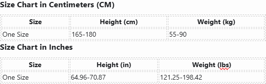 | One Size | 64.96-70.87 | 121.25-198.42 |