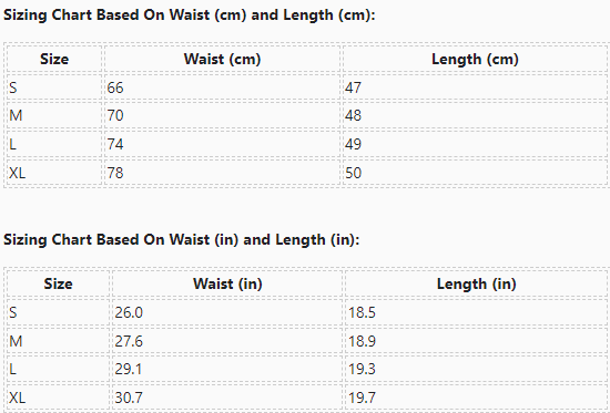 Sizing Chart Based On Waist (cm) and Length (cm):