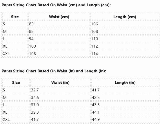Pants Sizing Chart Based On Waist (cm) and Length (cm):