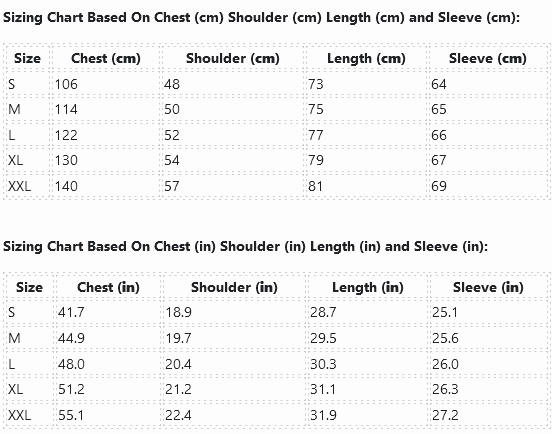Sizing Chart Based On Chest (cm) Shoulder (cm) Length (cm) and Sleeve (cm):