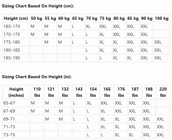 | 165-170 | M | M | M | L | XL | XXL | XXL | XXL | XXL | |