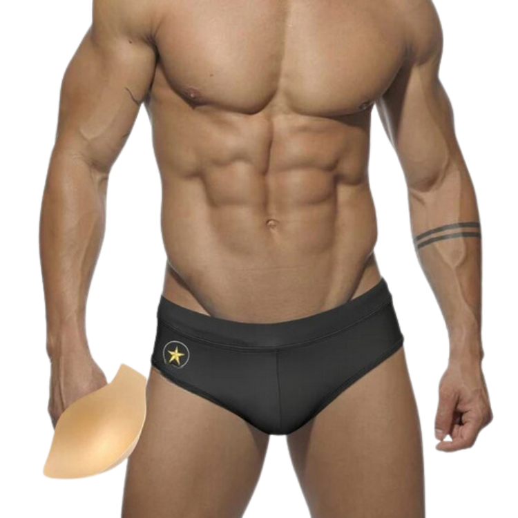 Imagine slipping into these swim briefs and feeling the transformative power of fashion. Made with a bold pattern that's as striking as a runway hit at a Lady Gaga concert, these briefs are all about celebrating your unique self. The design is reminiscent of a military star, but with a twist that's undeniably chic and daring. Perfect for the beach, pool, or your next fabulous boat party, these swim briefs are guaranteed to make heads turn and hearts flutter.