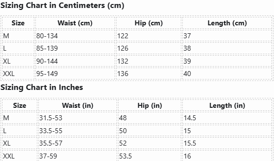 | Size | Waist (in) | Hip (in) | Length (in) |