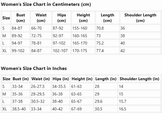 | Size | Bust (cm) | Waist (cm) | Hips (cm) | Height (cm) | Length (cm) | Shoulder Length (cm) |