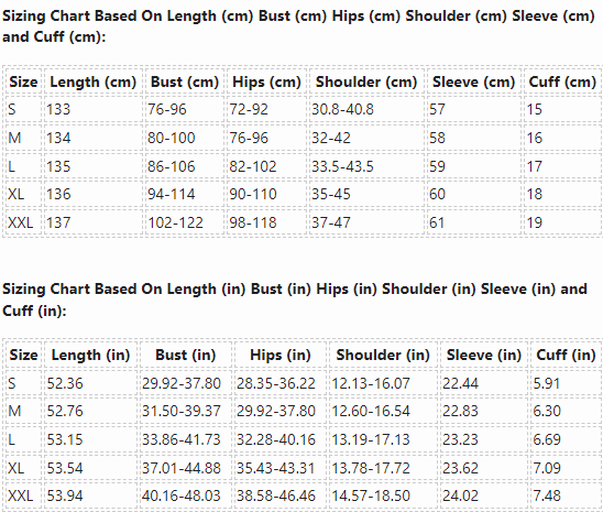 Sizing Chart Based On Length (cm) Bust (cm) Hips (cm) Shoulder (cm) Sleeve (cm) and Cuff (cm):
