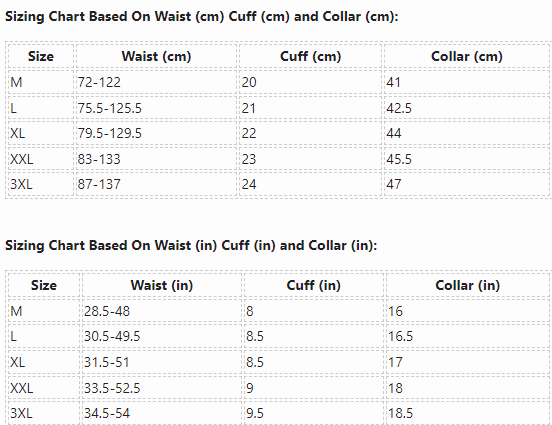 Sizing Chart Based On Waist (cm) Cuff (cm) and Collar (cm):