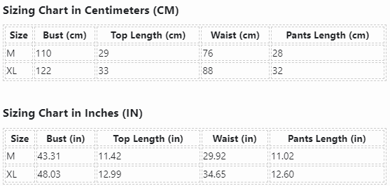 | Size | Bust (cm) | Top Length (cm) | Waist (cm) | Pants Length (cm) |