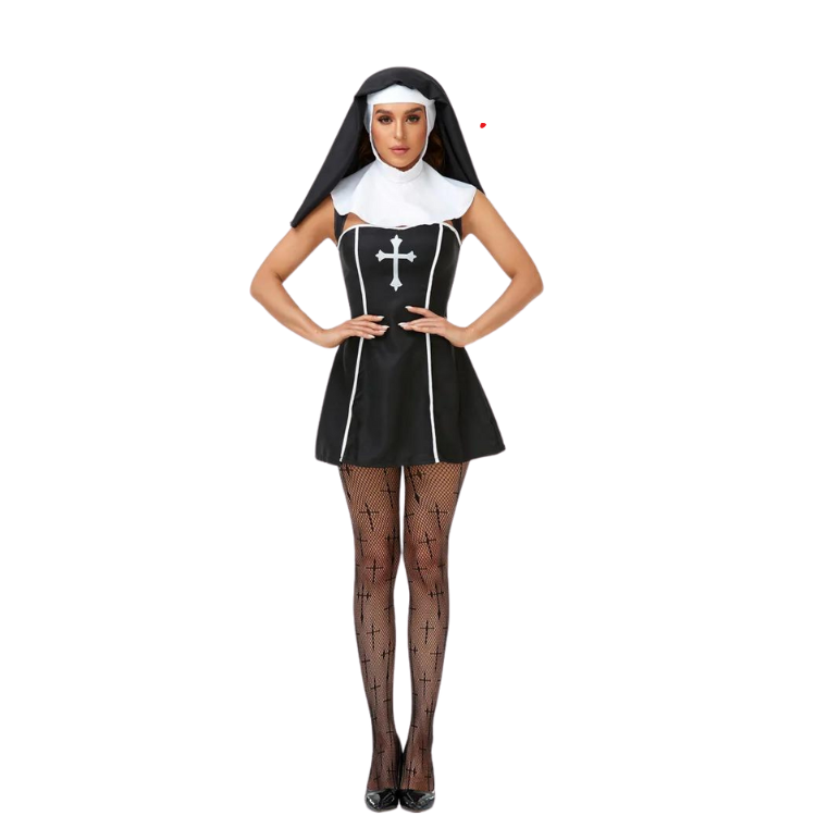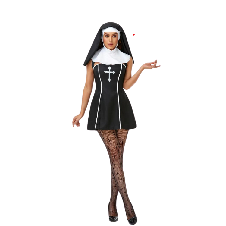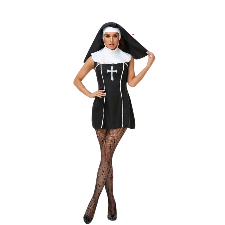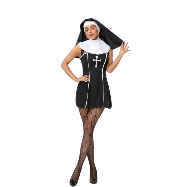 The Naughty Nun Costume is a heavenly mix of classic and contemporary, featuring a sleek, form-fitting black polyester robe that’s sinfully short and decidedly daring. The white collar adds a touch of the traditional nun’s habit, while the thigh-high slits whisper sweet heresies of style and sex appeal. It's a costume that doesn't just flirt with fashion; it makes it bow down in devotion. Whether you're aiming to bless a crowd with your presence or cast a spell of allure, this outfit is your gospel.