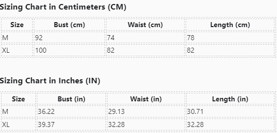 | Size | Bust (cm) | Waist (cm) | Length (cm) |