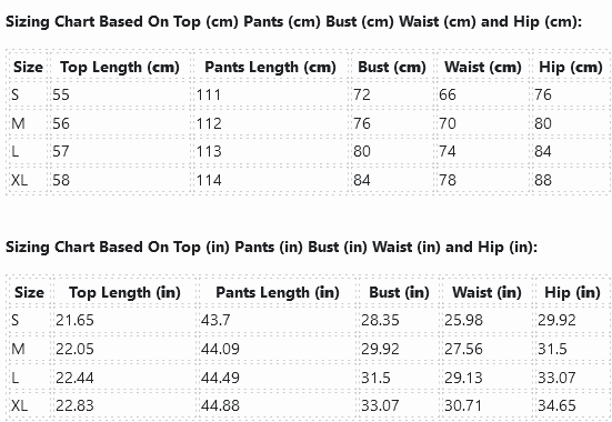 Sizing Chart Based On Top (cm) Pants (cm) Bust (cm) Waist (cm) and Hip (cm):