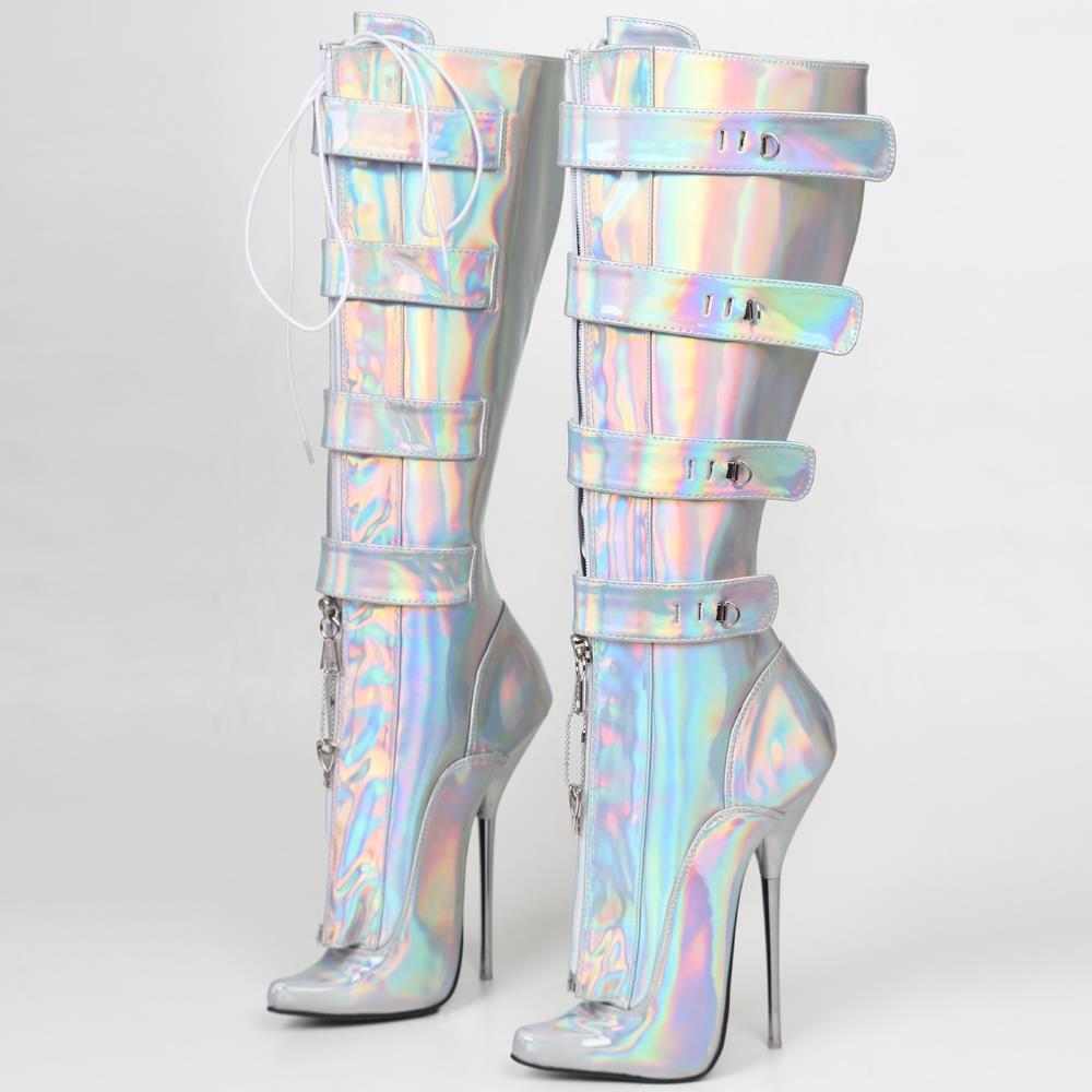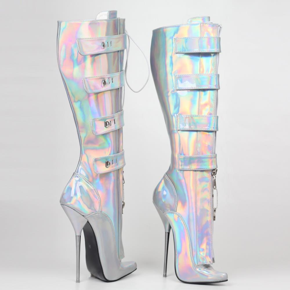 Step into the Spotlight with Neon Silver Mid Calf Heel Boots - Shine Bright, Be Bold!