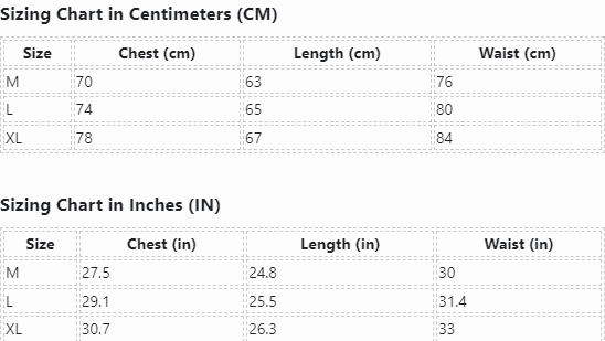 | Size | Chest (cm) | Length (cm) | Waist (cm) |