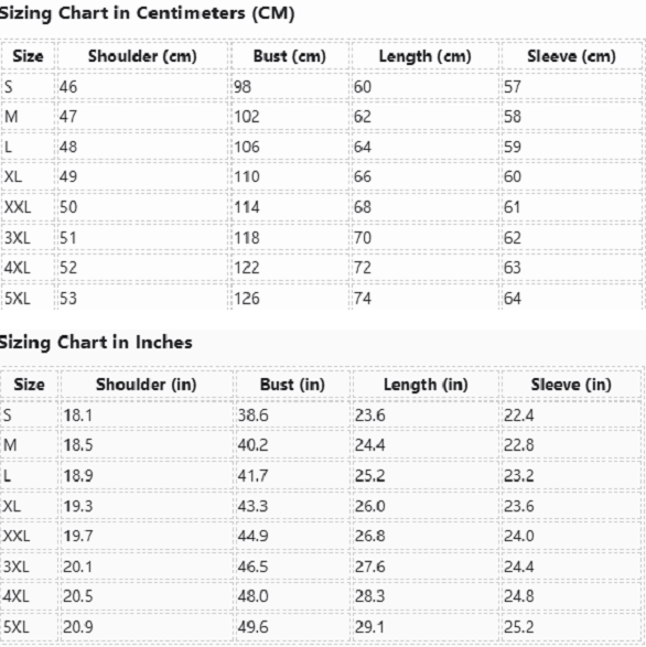 | Size | Shoulder (cm) | Bust (cm) | Length (cm) | Sleeve (cm) |