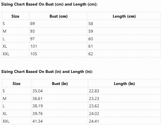 Sizing Chart Based On Bust (cm) and Length (cm):