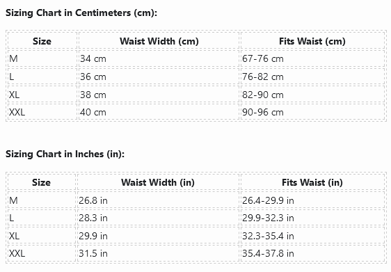 | Size | Waist Width (cm) | Fits Waist (cm) |