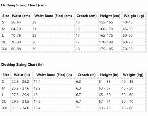 | Size | Waist (cm) | Waist Band (Flat) (cm) | Crotch (cm) | Height (cm) | Weight (kg) |