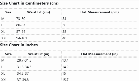 | Size | Waist Fit (cm) | Flat Measurement (cm) |