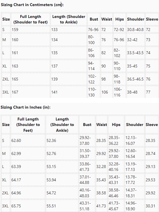 | Size | Full Length (Shoulder to Feet) | Length (Shoulder to Ankle) | Bust | Waist | Hips | Shoulder | Sleeve |