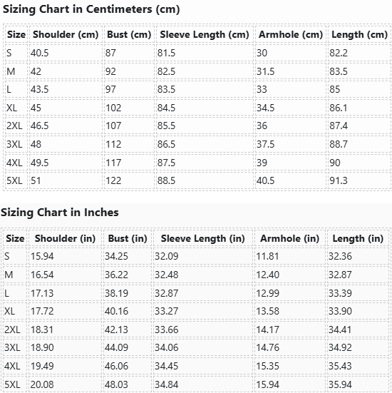 | Size | Shoulder (cm) | Bust (cm) | Sleeve Length (cm) | Armhole (cm) | Length (cm) |