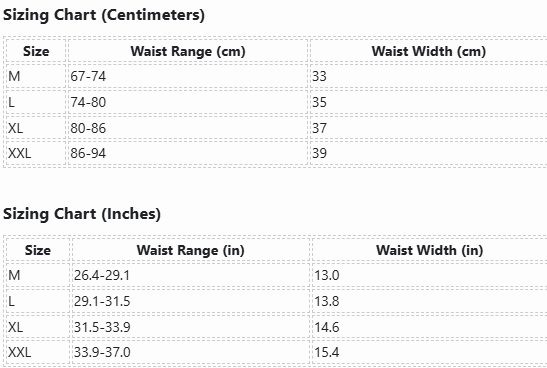 | Size | Waist Range (cm) | Waist Width (cm) |
