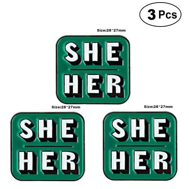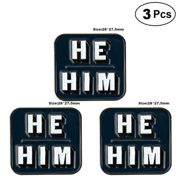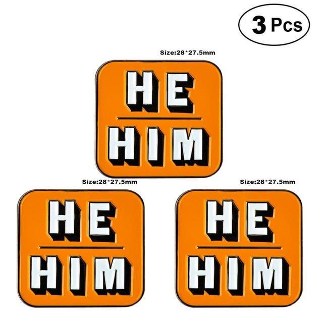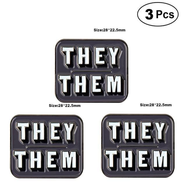 These pins allow you to share with the world your personal pronouns. There is 'he / him', 'she / her' or 'they/them' for people who are gender-nonconforming or don't conform to binary male/female gender categorizations.