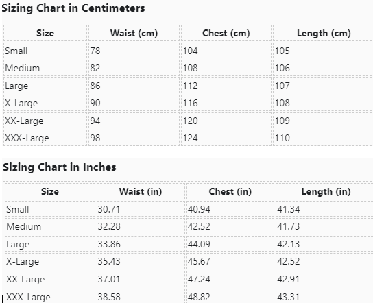 | Size | Waist (in) | Chest (in) | Length (in) |