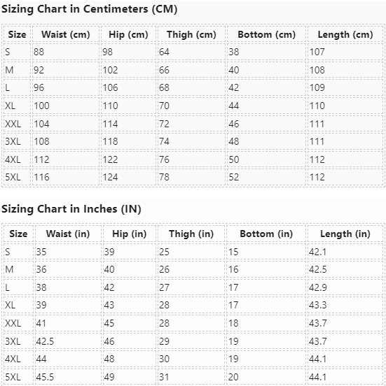 | Size | Waist (cm) | Hip (cm) | Thigh (cm) | Bottom (cm) | Length (cm) |