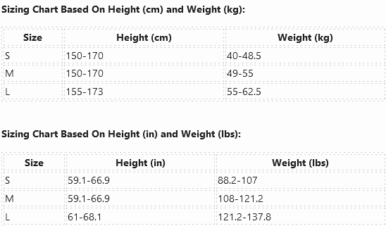 Sizing Chart Based On Height (cm) and Weight (kg):