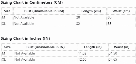 | Size | Bust (Unavailable in CM) | Length (cm) | Waist (cm) |