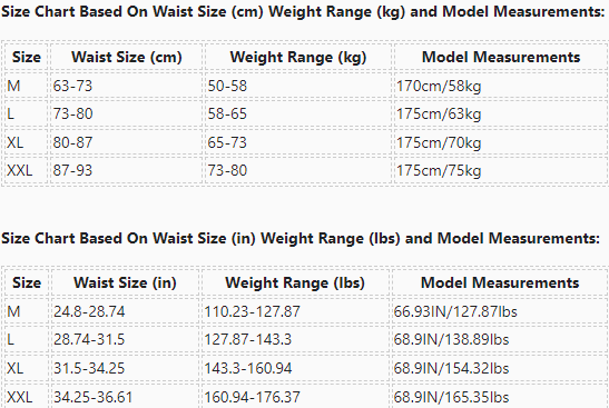 | Size | Waist Size (cm) | Weight Range (kg) | Model Measurements |