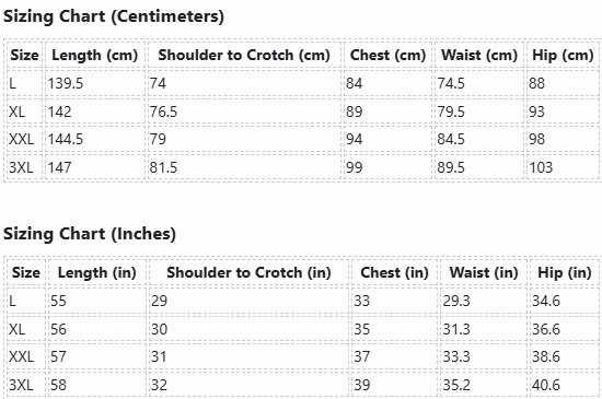 | Size | Length (cm) | Shoulder to Crotch (cm) | Chest (cm) | Waist (cm) | Hip (cm) |
