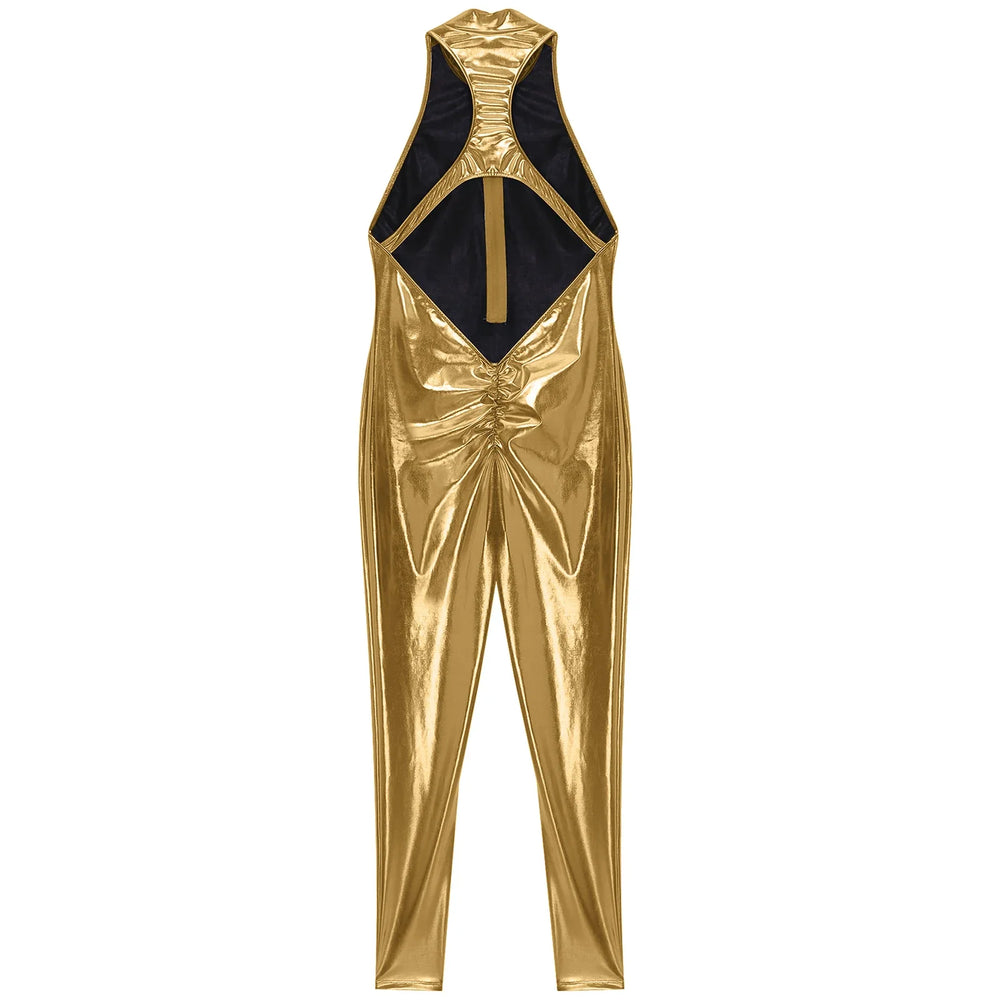 Crafted from a scintillating blend of polyester and spandex, this bodysuit clings like a glamorous second skin, accentuating every curve and muscle with its reflective metallic sheen. As you move, so does the sparkle, mirroring the disco balls of the wildest parties of the past and infusing your every step with an electric charge of allure and charisma.