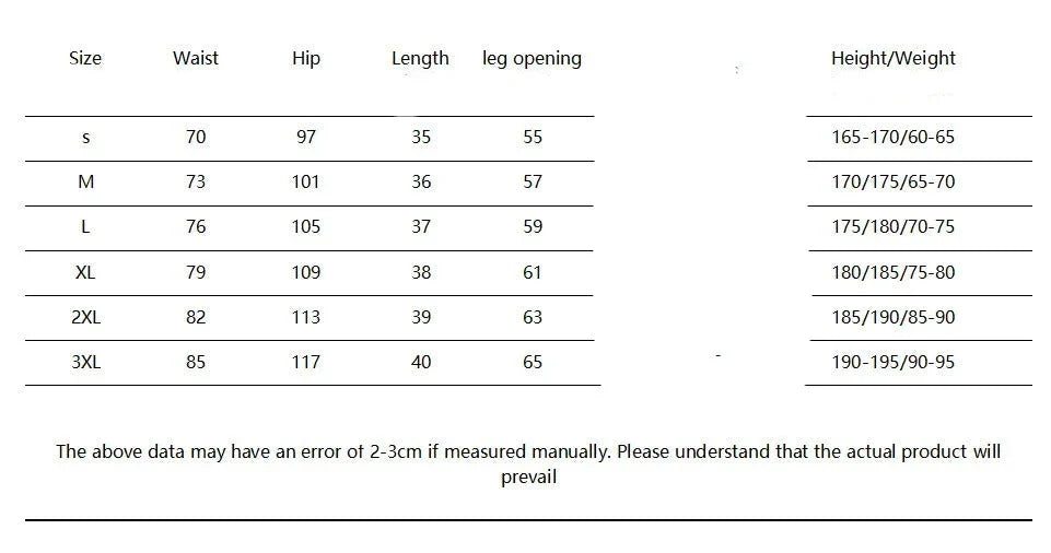 | Size | Waist (cm) | Hip (cm) | Length (cm) | Leg Opening (cm) | Height (cm) | Weight (kg) |
