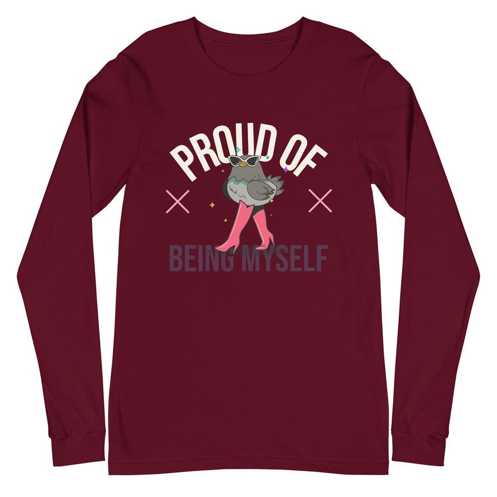 So, my dears, wear this Proud Of Being Myself Unisex Long Sleeve T-Shirt with all the PRIDE with which we intended it. Let it be a symbol of your identity, a canvas for your expression, and a banner of your belonging. Because in this tee, you're not just wearing fabric; you're wearing your heart on your sleeve, quite literally. And remember, in a world where you can be anything, be proudly, unequivocally, fabulously you. x