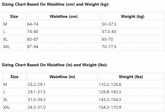Sizing Chart Based On Waistline (cm) and Weight (kg):