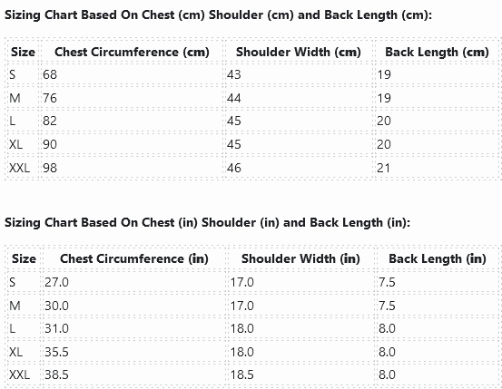Sizing Chart Based On Chest (cm) Shoulder (cm) and Back Length (cm):