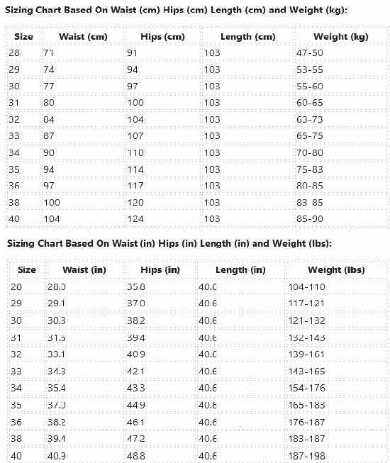 Sizing Chart Based On Waist (in) Hips (in) Length (in) and Weight (lbs):