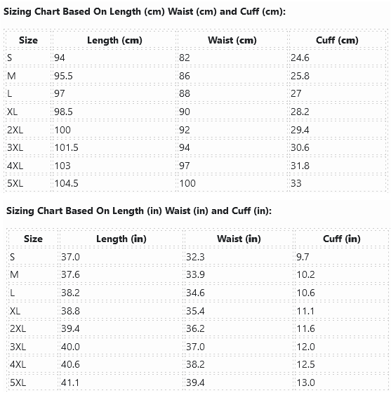 Pants Sizing Chart Based On Length (in) Waist (in) and Cuff (in):