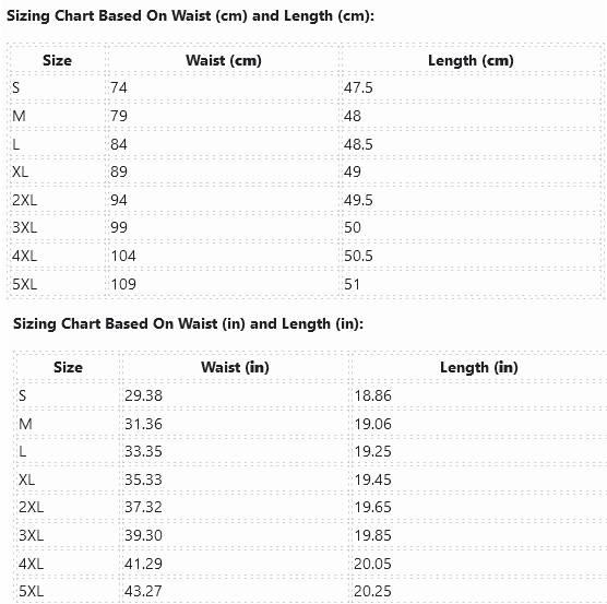 Short Sizing Chart Based On Waist (cm) and Length (cm):