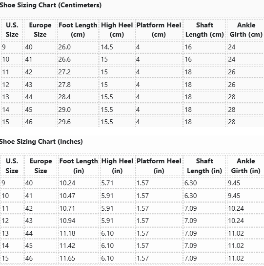 | U.S. Size | Europe Size | Foot Length (cm) | High Heel (cm) | Platform Heel (cm) | Shaft Length (cm) | Ankle Girth (cm) |