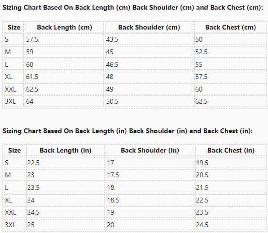 Sizing Chart Based On Back Length (cm) Back Shoulder (cm) and Back Chest (cm):