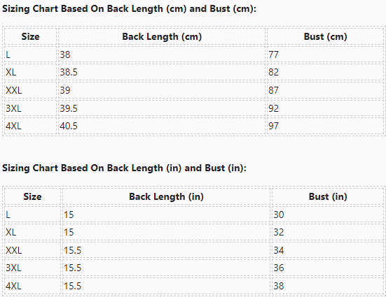 Sizing Chart Based On Back Length (in) and Bust (in):