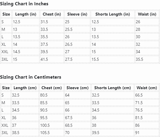 | Size | Length (cm) | Chest (cm) | Sleeve (cm) | Shorts Length (cm) | Waist (cm) |