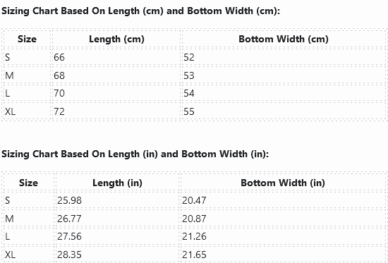 Sizing Chart Based On Length (cm) and Bottom Width (cm):