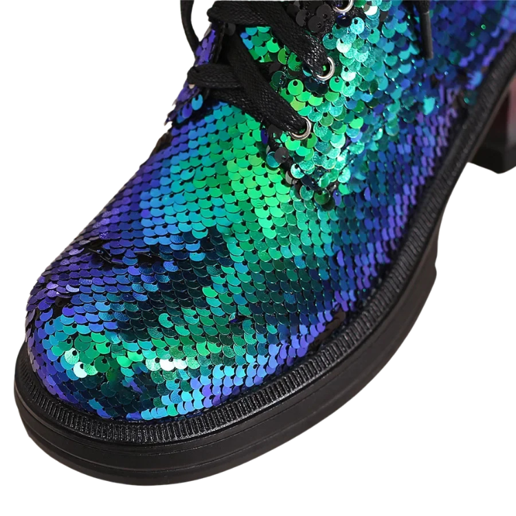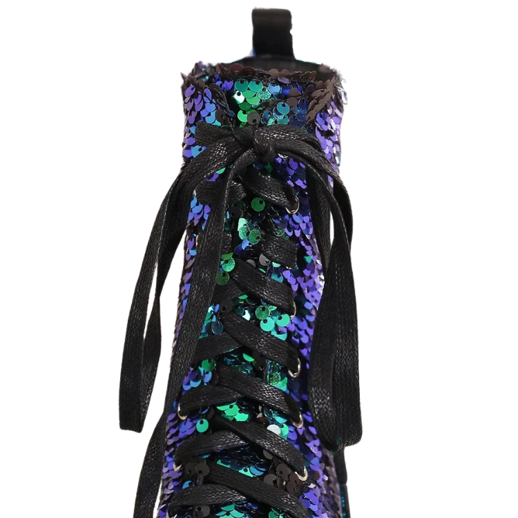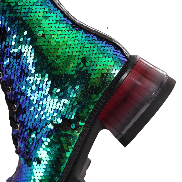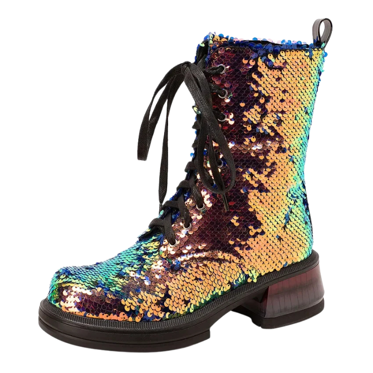 Perfect for anyone who believes that every day is an opportunity to showcase their unique style, the British Sequins Combat Boots are your new go-to for any occasion that calls for a touch of glam with a lot of grit. Pair them with skinny jeans, a leather jacket, or even your best drag ensemble—these boots are versatile!