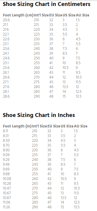 | Foot Length (in) | Int'l Size | EU Size | US Size | AU Size |