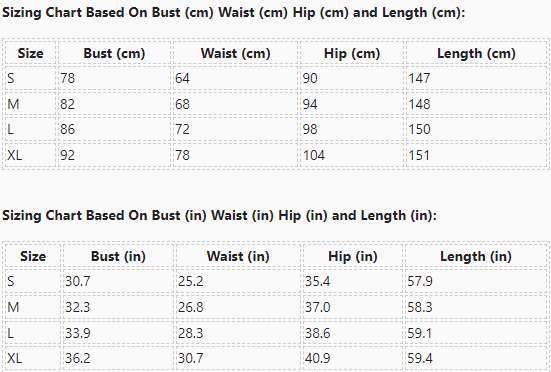 Sizing Chart Based On Bust (cm) Waist (cm) Hip (cm) and Length (cm):