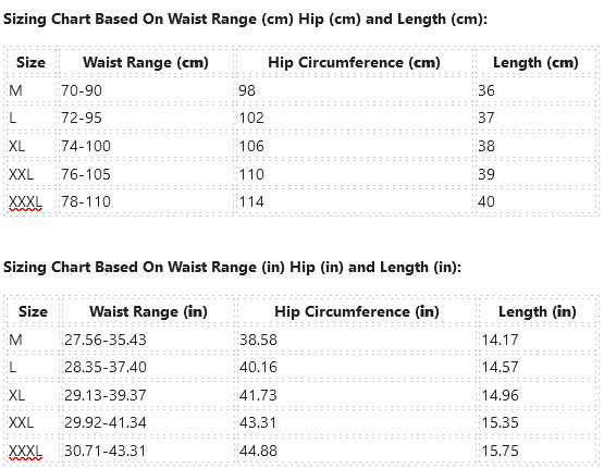 | Size | Waist Range (cm) | Hip Circumference (cm) | Length (cm) |