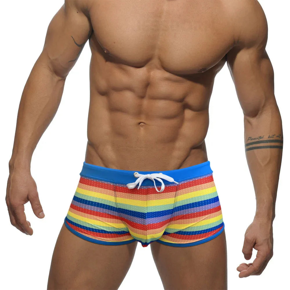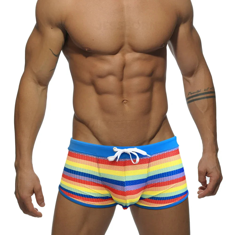 Imagine yourself at the beach or poolside, turning heads not just for your radiant personality but also for these eye-catching trunks. Adorned with a rainbow pattern, these trunks scream confidence and charisma. They're not just swimwear; they're a statement. A nod to gay pop culture icons and a wink to the classic pride flag, these trunks are as fabulous as a RuPaul runway and as iconic as Elton John's glasses.